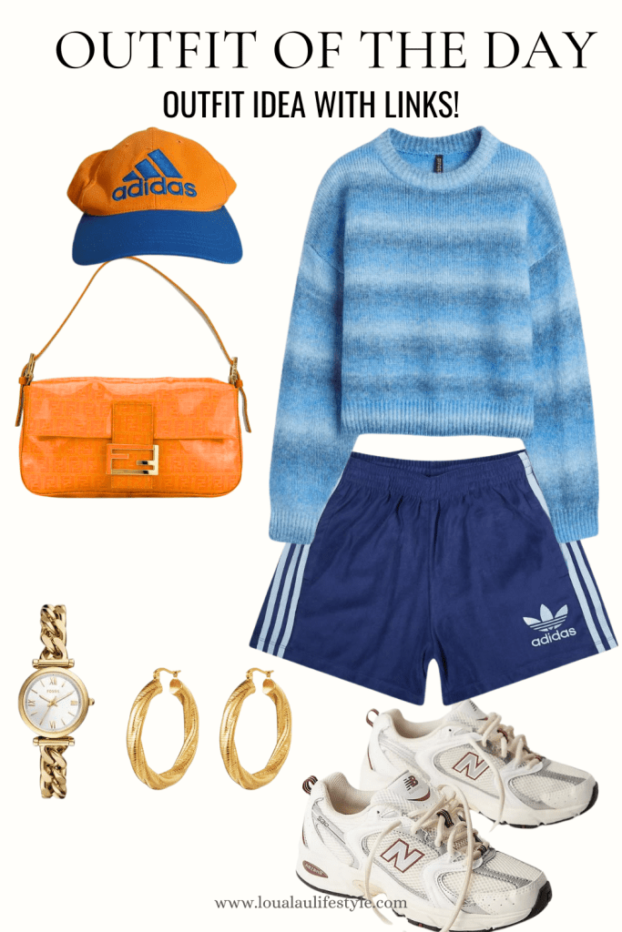 This bright orange Fendi-inspired bag and matching Adidas cap bring a bold pop of color to the outfit. It’s the perfect contrast to the cool blue tones!