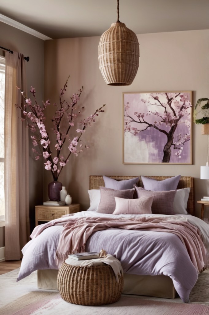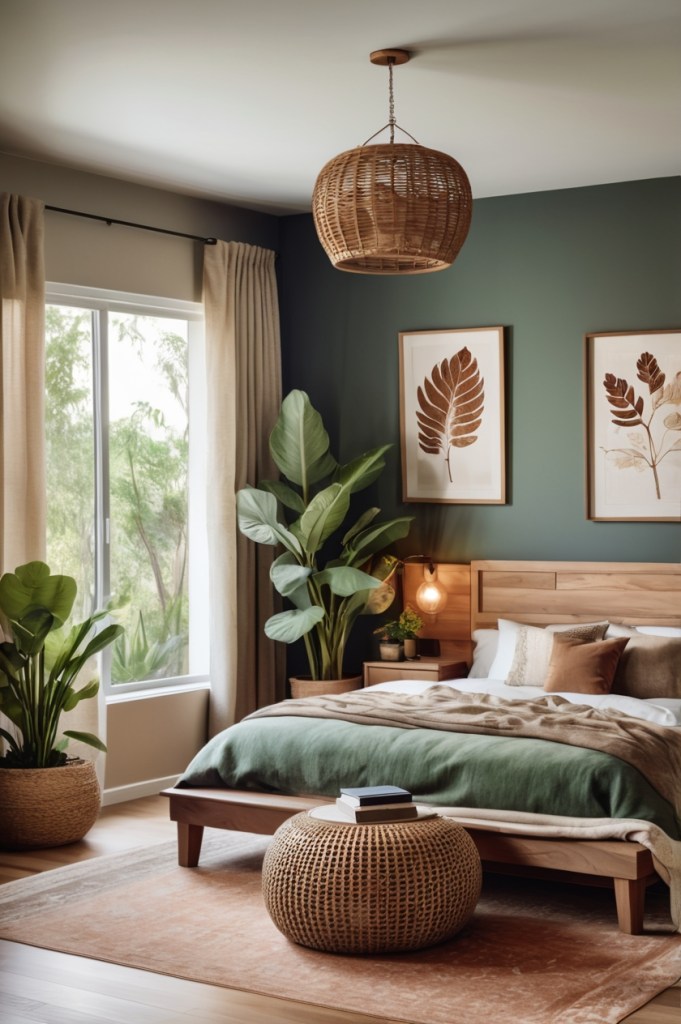 - Add a sheepskin rug next to the bed or a woven wall hanging to add a cozy, bohemian touch.