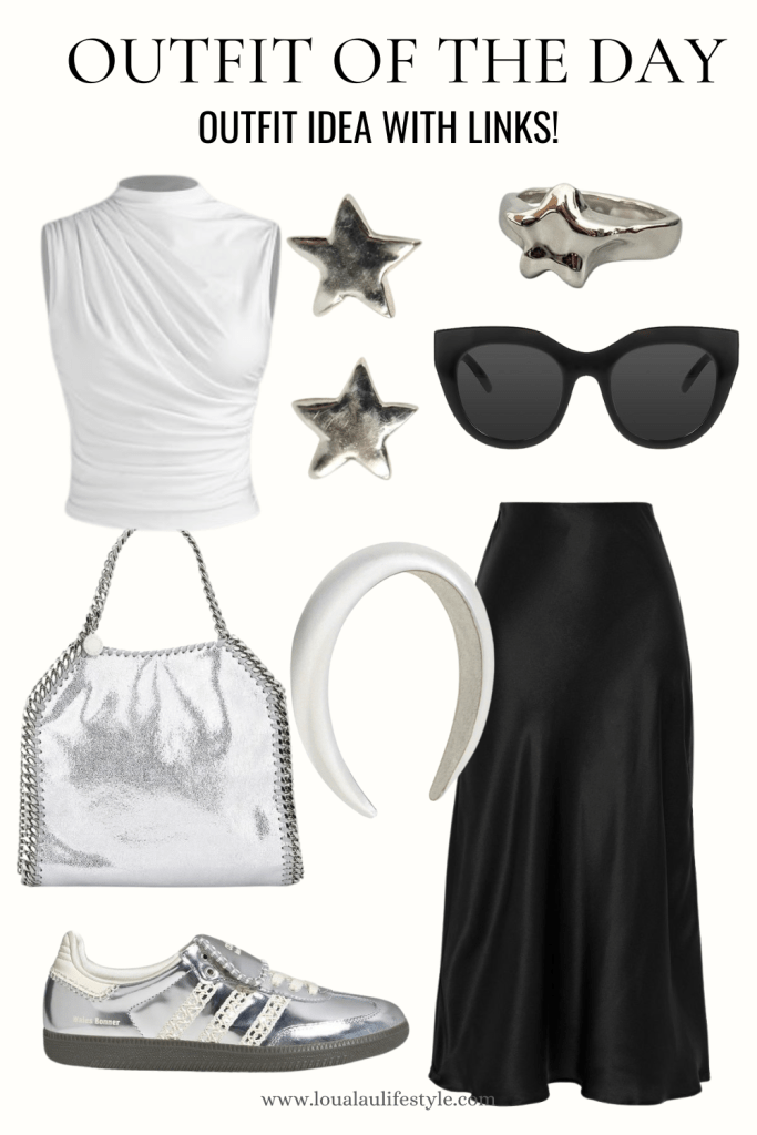 This outfit is all about balance—shiny yet simple, playful yet polished. It’s a prime example of how accessories can totally elevate a basic black and white look. Whether you’re heading to brunch or wandering through the city, this look will have you turning heads.