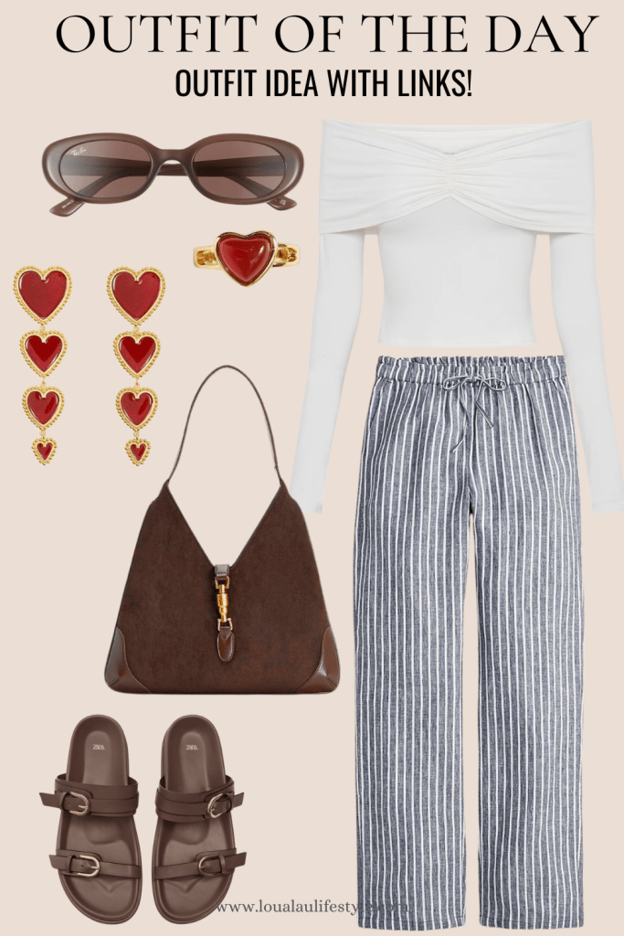 This chic ensemble combines flirty accessories with relaxed striped pants and a timeless off-shoulder top. Whether you’re heading out for brunch, shopping with friends, or capturing Instagram-worthy moments, this outfit will have you looking put-together, comfortable, and fashion-forward.